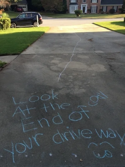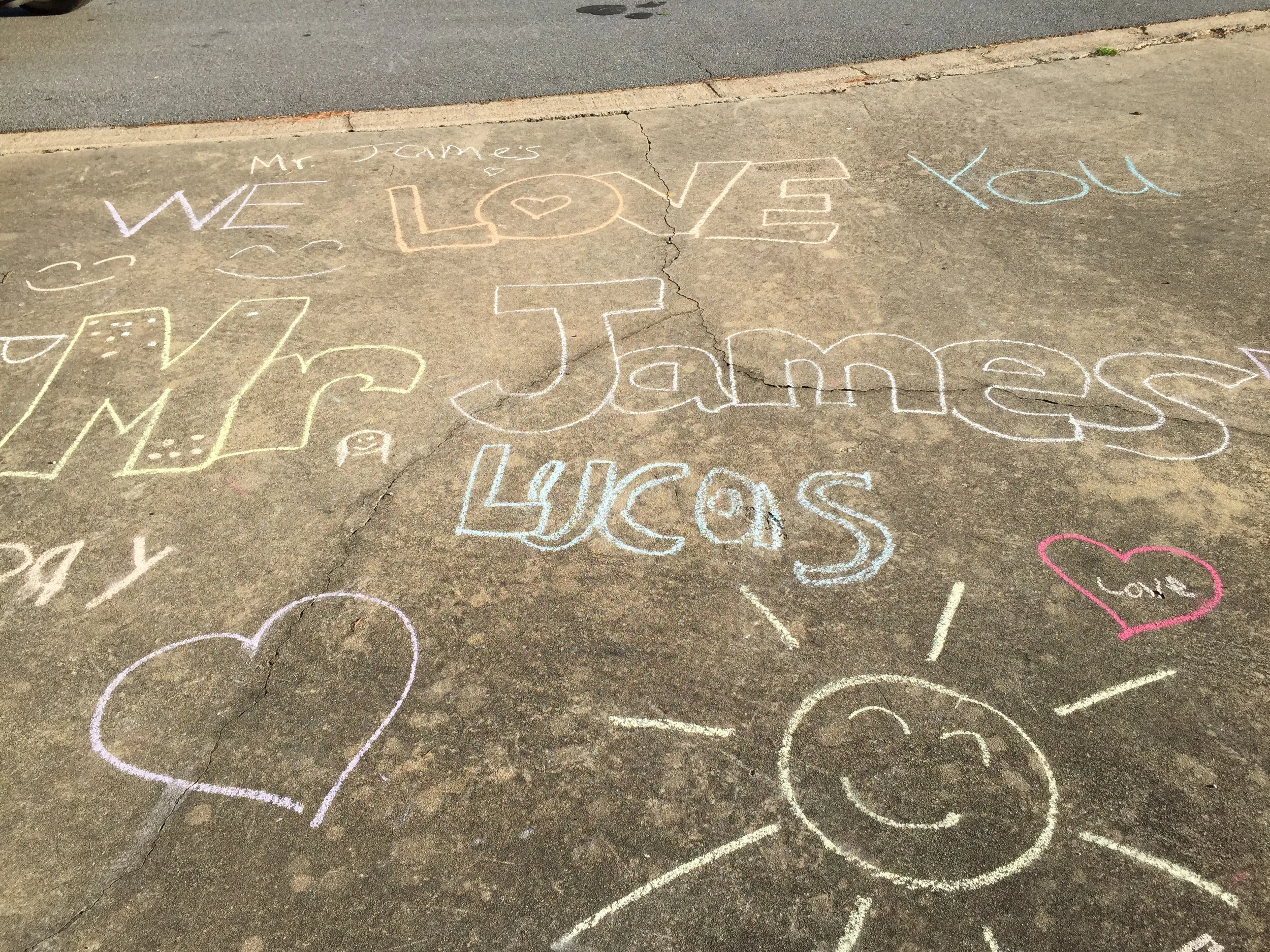 I want to zoom in even closer though, to look at even smaller things that can make a difference - things that we are all capable of doing. My father is 87 and doesn’t get out much. He does get to the end of the driveway to get his mail, and one day while doing so, he was surprised and delighted by the chalk message the children in the neighborhood had left for him. He wanted to make sure that he took a picture so that he could show his friends this surprise act of kindness.